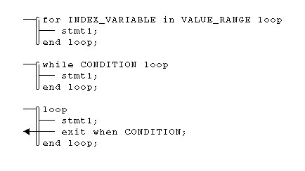 Iterative statements, no matter the form, are all respresented identically in the CSD: an elongated loop denotes the beginning and the end of the iterative section of code, as shown below. The figure below shows the CSD for the three types of loops found in Ada, the for loop, the while loop, and the basic loop.